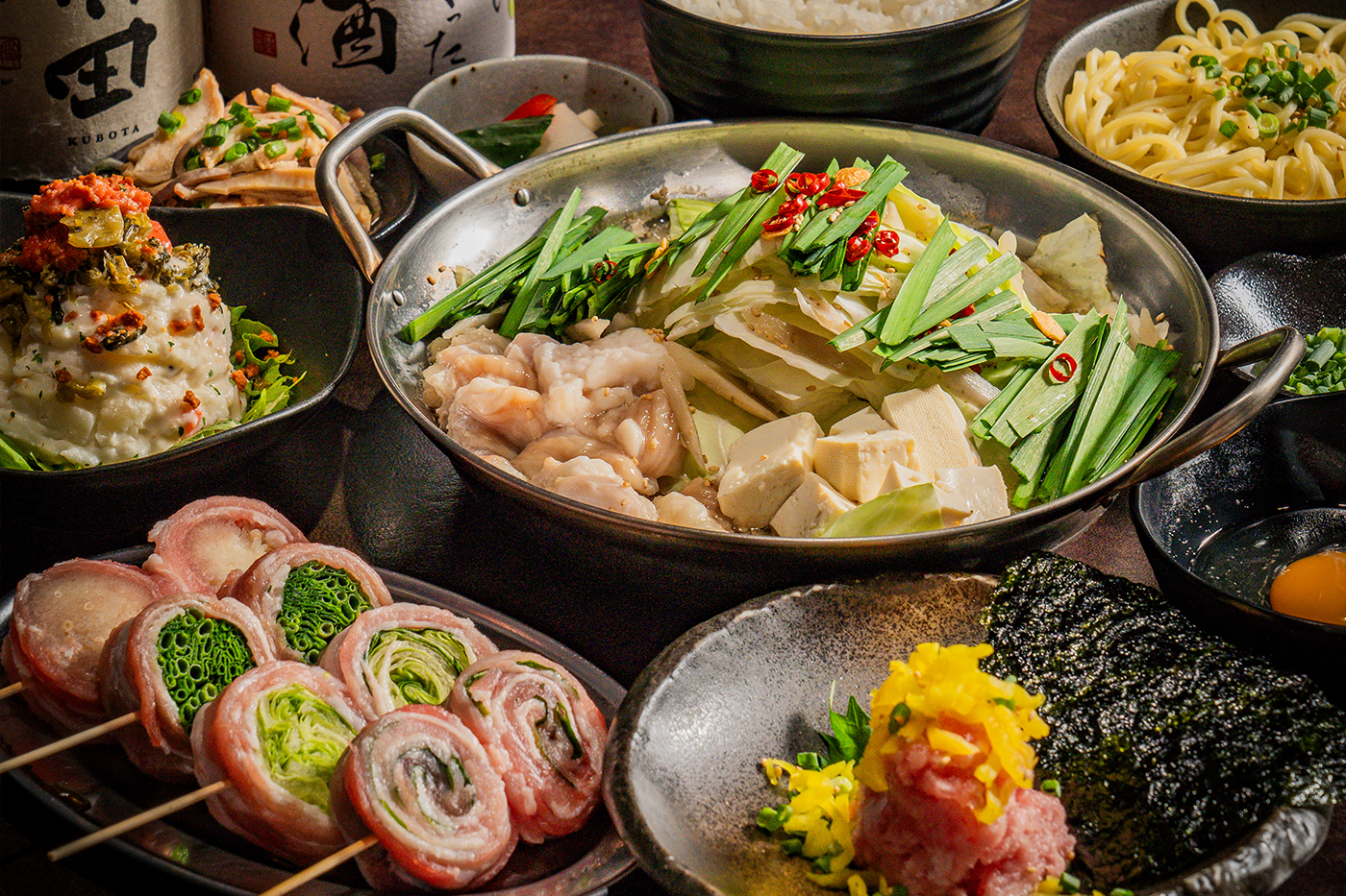 プリップリのもつ鍋と名物野菜巻き串で味わう本場博多の逸品。